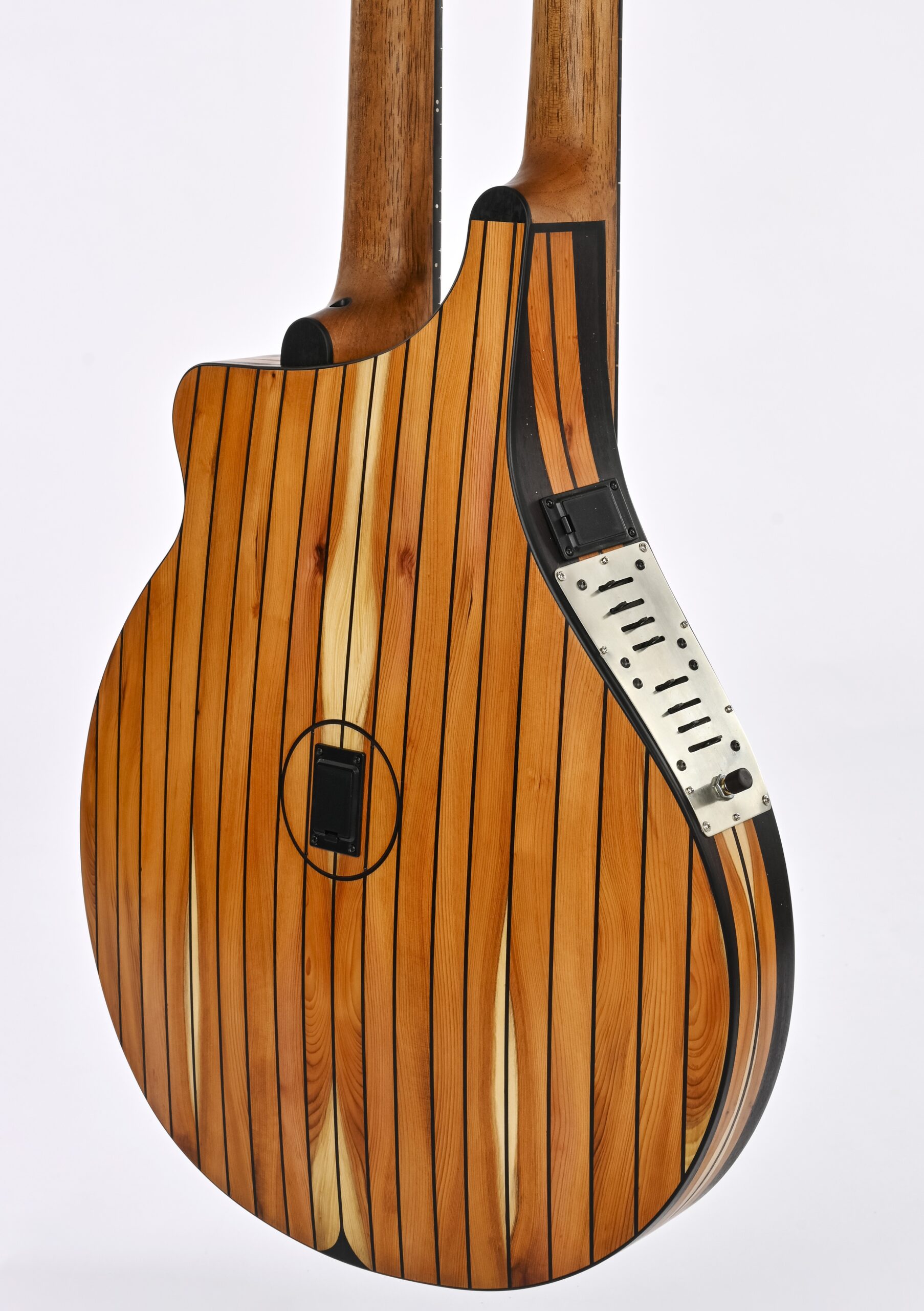 The second neck is fretless and the string tension very low to imitate the sound of an Arabic oud.