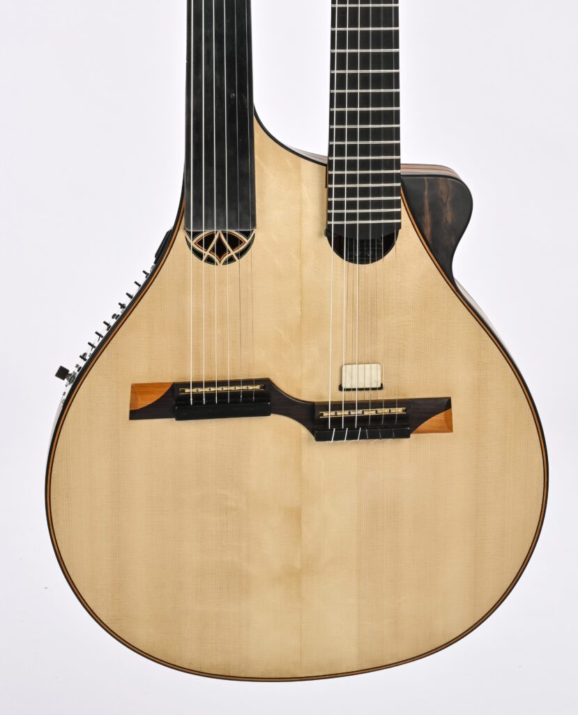 quarter tone fretboard for nylon strings and fretless metallic neck for steel strings.